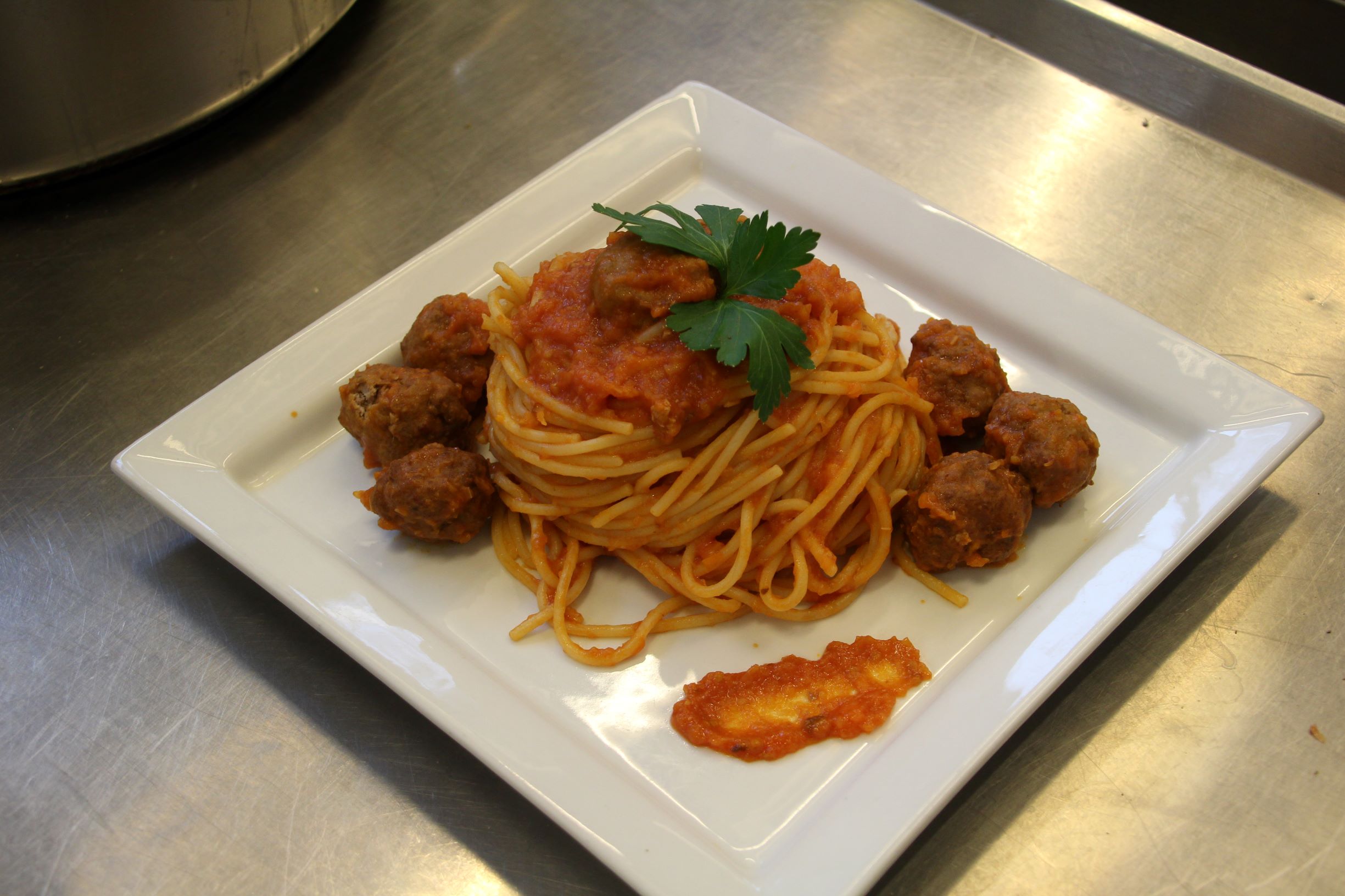 Gli italiani un classico spaghetti al sugo con polpette.